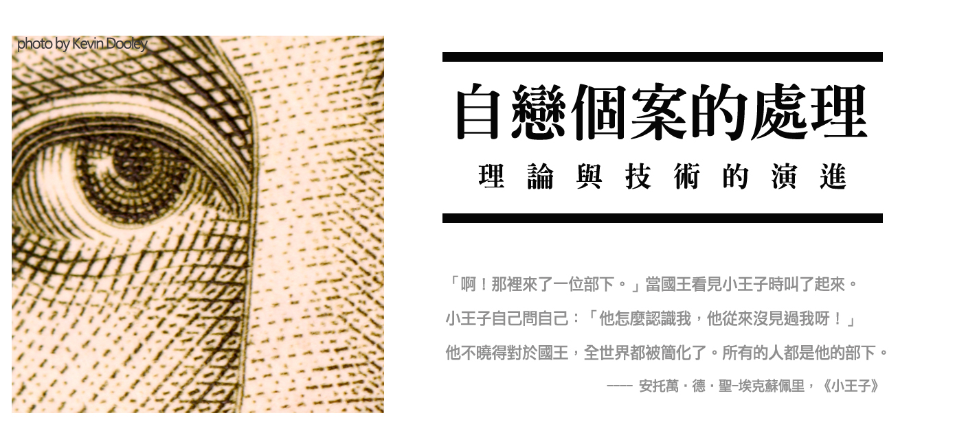 從古典的理論發展至今,精神分析師們對於自戀的看法有了許多轉折,而在現今的治療室中,自戀個案也持續帶給治療者們極大的挑戰。滔滔不絕沈溺在自我世界裡的個案,讓沮喪的治療師覺得即使自己站起來離開也不會被察覺、理直氣壯要求治療師滿足他一切期望的個案,讓被激怒的治療師不禁想擺脫掉他……。