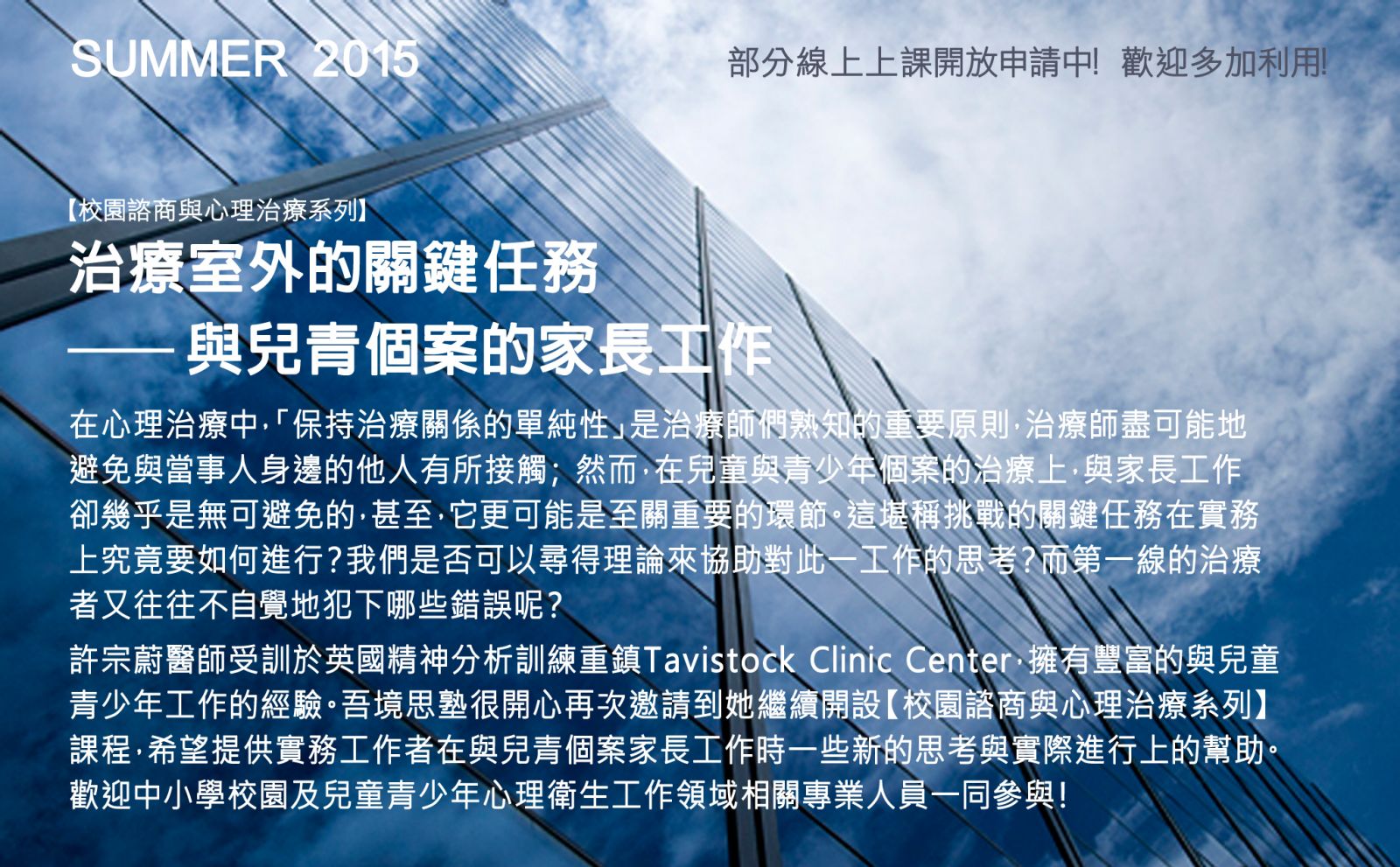 - 本課程適合中小學校園輔導諮商相關專業人員、兒童青少年心理衛生工作領域相關專業人員,及心理相關系所學生報名參加。